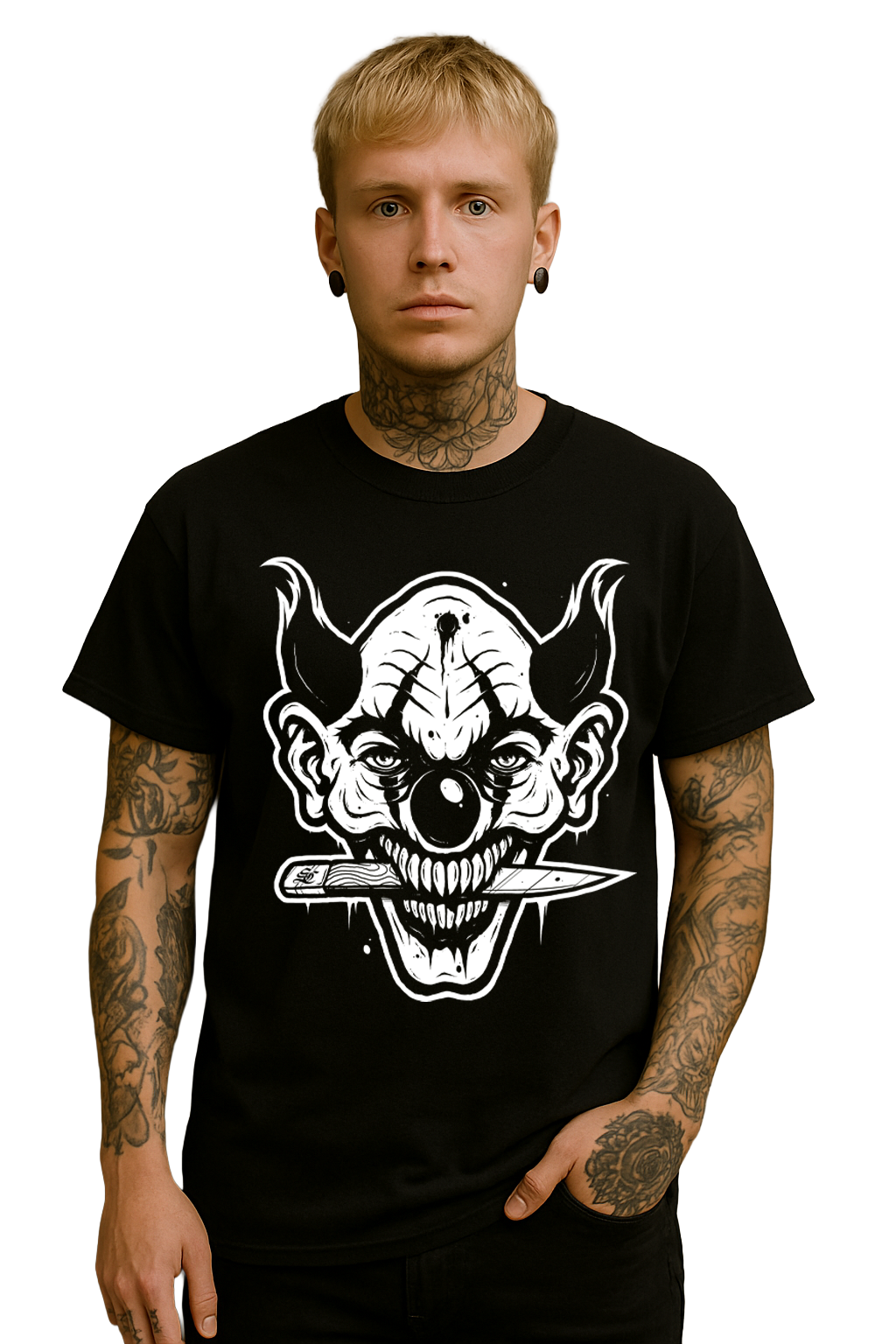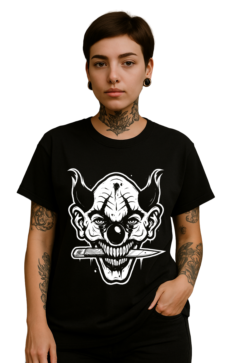 Dieses Shirt ist nichts für schwache Nerven. Das massive Clown-Motiv mit seinem dämonischen Grinsen und dem Messer zwischen den Zähnen liefert puren Horror-Streetstyle. Die Illustration ist roh, kontrastreich und maximal bedrohlich – genau das, was ein echtes Statement-Piece ausmacht.