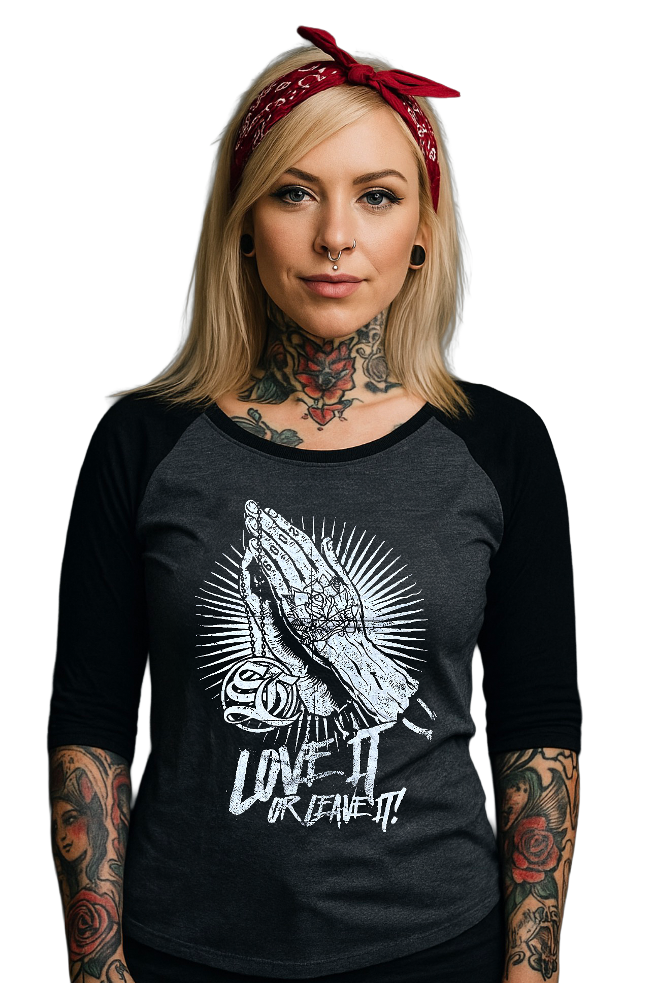 Dieses Raglan-Shirt ist wie gemacht für Girls, die Haltung zeigen. Das ikonische Motiv mit den tätowierten betenden Händen und dem starken Schriftzug “LOVE IT OR LEAVE IT!” steht für Loyalität, Stärke und klare Attitude. Der strahlende Linienkranz im Hintergrund verleiht dem Design einen fast heiligen, aber gleichzeitig rebellischen Touch – typisch Streetside, typisch du.