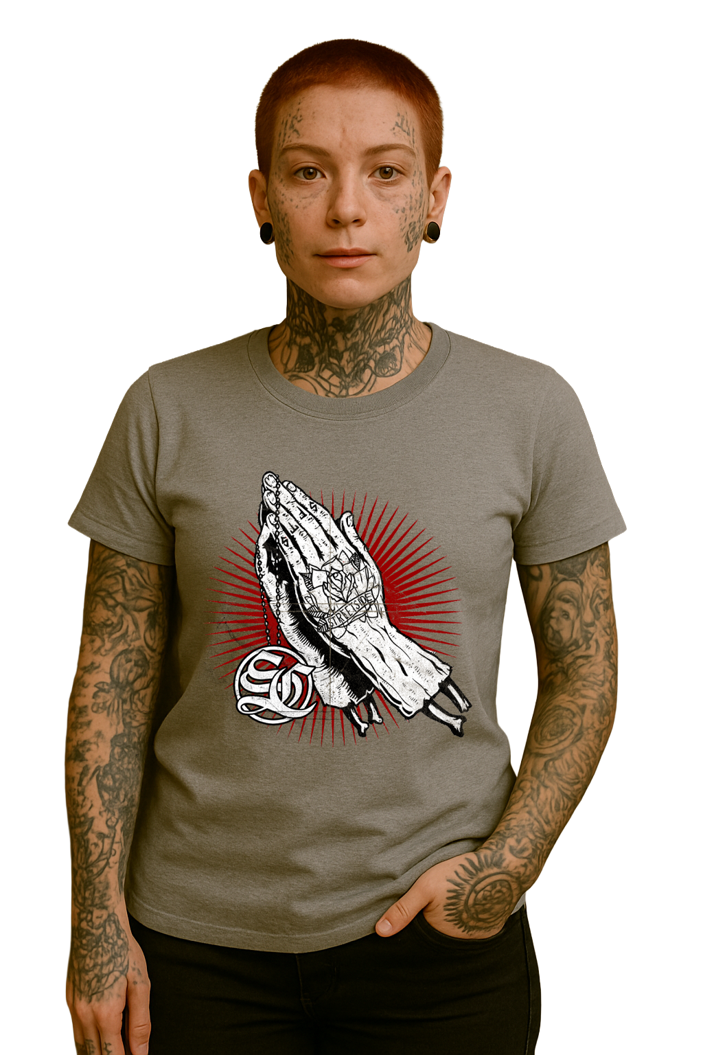 Dieses Shirt verbindet klassische Symbolik mit rauem Streetstyle. Die tätowierten, betenden Hände stehen für Hoffnung, Loyalität und den unerschütterlichen Glauben an den eigenen Weg. Das kräftige rote Strahlenmuster dahinter bringt Power ins Motiv und erzeugt einen ikonischen, fast heiligen Look – nur eben im Streetside-Flavor.