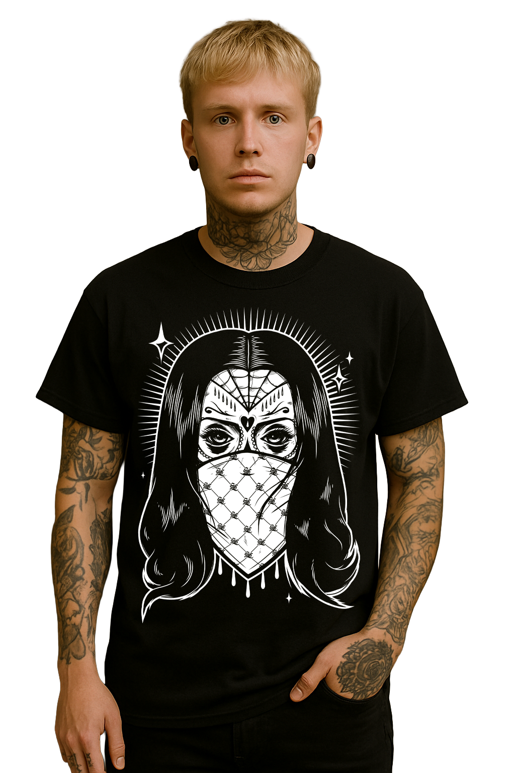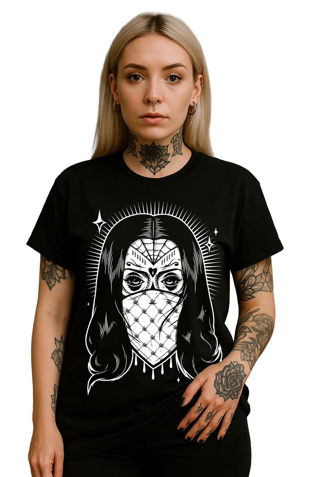 Dieses Shirt strahlt eine einzigartige Mischung aus Stärke, Eleganz und Street-Mystik aus. Die maskierte Frau mit langen Haaren und fein ausgearbeiteten Gesichtselementen wirkt wie eine moderne Ikone der Untergrundkultur. Das Herzsymbol, die Ornamentlinien und der leuchtende Strahlenkranz geben dem Motiv einen heiligen, fast spirituellen Touch – aber immer mit einem dunklen, rebellischen Twist.
