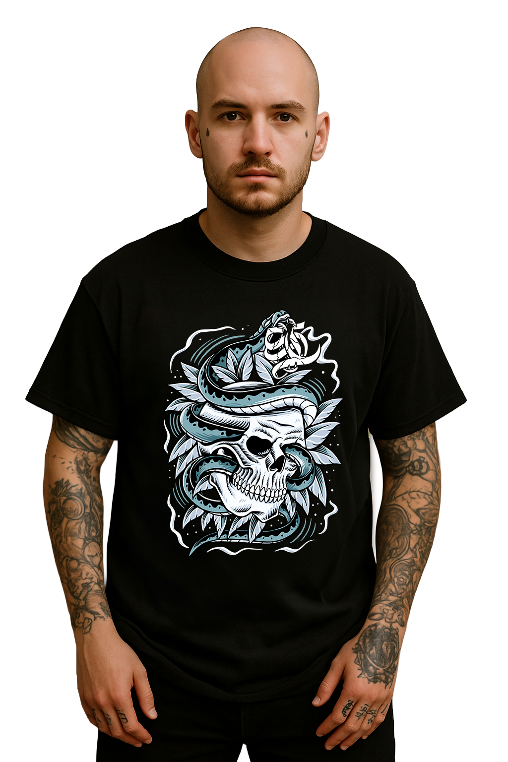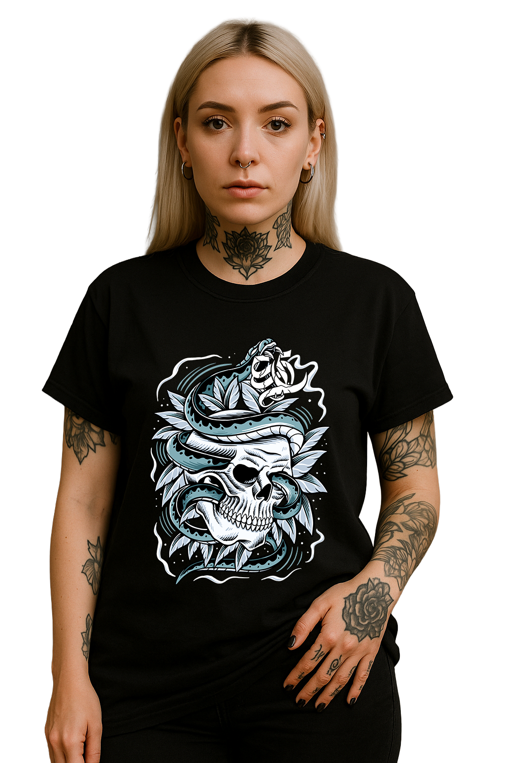 Dieses Shirt bringt eine Mischung aus Gefahr und Eleganz auf ein einziges episches Motiv. Die geschwungene Schlange, die sich durch den Schädel windet, erzeugt eine kraftvolle, fast mythische Dynamik. Das Zusammenspiel aus weichen Farbverläufen, scharfen Linien und botanischen Elementen verleiht dem Design eine hochwertige Tattoo-Illustrationsoptik – düster, ästhetisch und absolut streetside.
