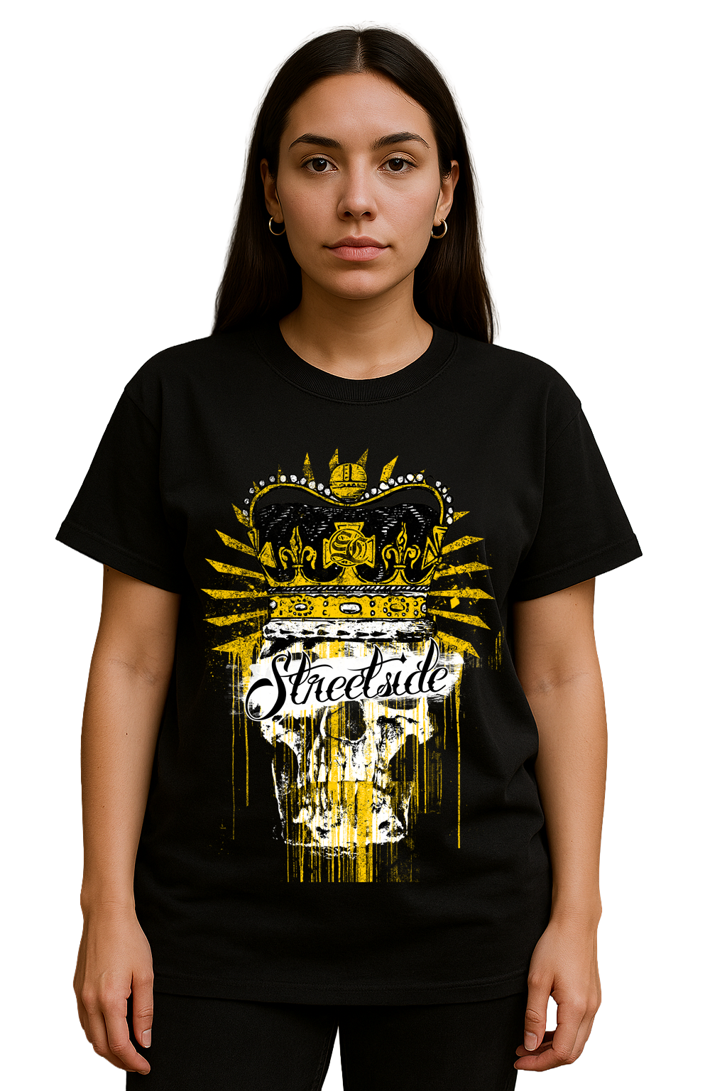 Dieses Shirt bringt königlichen Streetstyle auf ein strahlend weißes Fundament. Der detaillierte Skull mit Krone, Flowelements und radialem Linienburst wirkt wie ein Emblem einer eigenen Untergrund-Dynastie. Das markante „STREETSIDE“-Lettering darüber setzt ein starkes Statement – selbstbewusst, klar und kompromisslos.