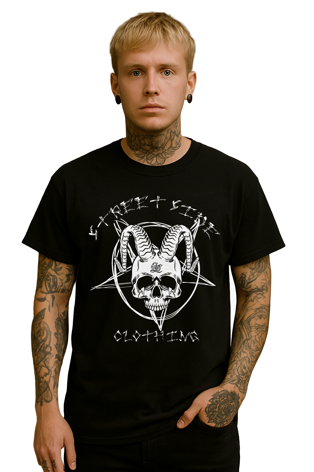 Dieses Shirt bringt eine extra Portion Darkness auf die Brust. Der detailliert gezeichnete Ziegen-Schädel mit massiven Hörnern sitzt vor einem groben Pentagram-Style-Symbol – ein Motiv, das direkt aus der Welt des Okkulten und Heavy-Street-Art entsprungen scheint. Die kantige, fast eingeritzte Typografie von „STREETSIDE CLOTHING“ verstärkt den rohen, rituellen Look.